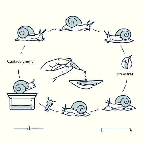 La extracción de la baba de caracol se lleva a cabo de manera no invasiva, donde los caracoles se desplazan sobre superficies limpias y se recoge la baba de manera delicada sin causarles ningún daño ni estrés.